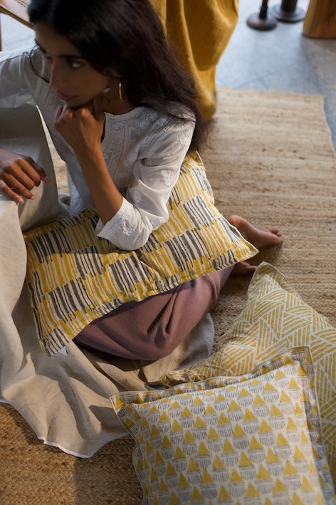 Mustard Ochre Hand Block Printed Cushion Cover - Prisma Pattern